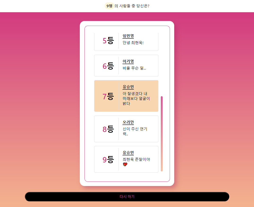 아직 고칠 방법을 제대로 알지 못해 내부 overflow : scroll로 바꿔버렸다 ^-^(진짜 미치겠다...