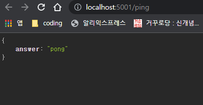 http://localhost:5001/ping으로 접속하면 만들어둔 목업 데이터를 확인할 수 있음.