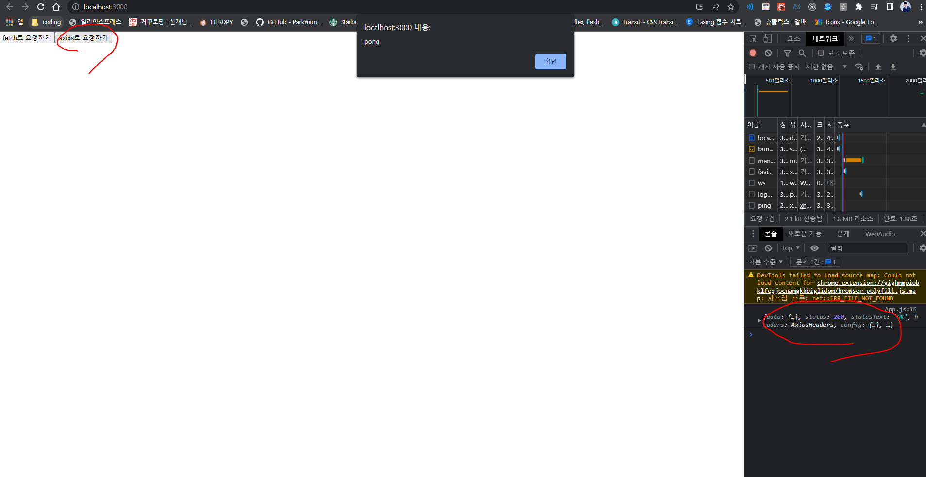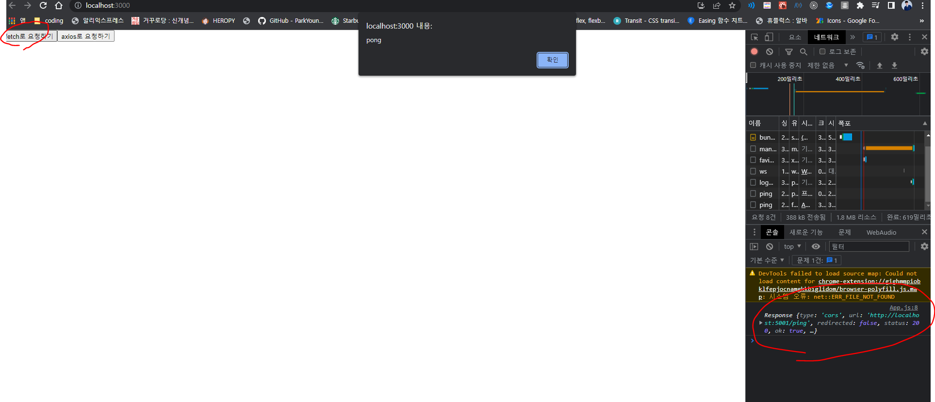 3. fetch나 axios로 “http://localhost:5001/ping”으로 get 요청하기