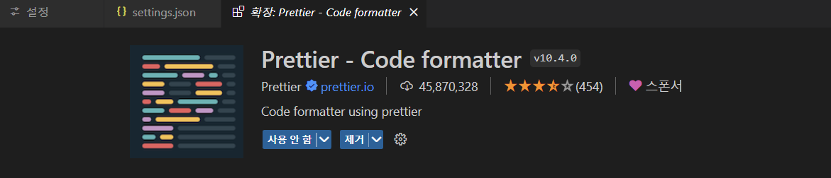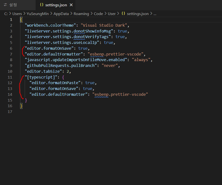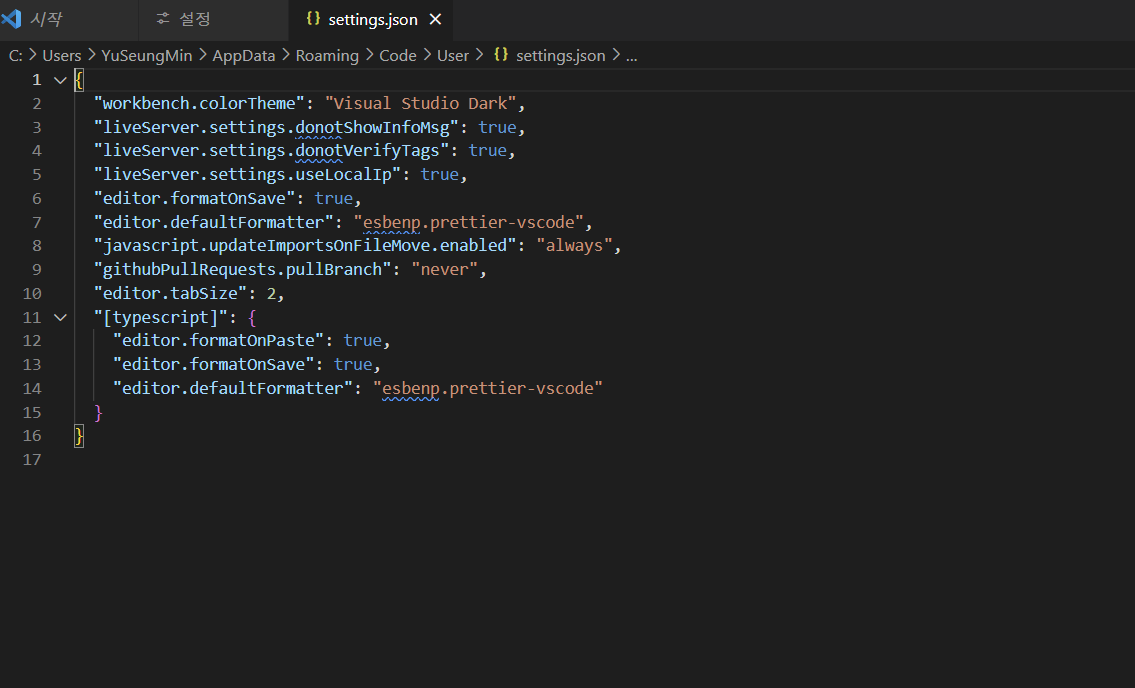 설치 후에는 settings.json 파일에서 설정을 해줘야만 제대로 동작을 한다.