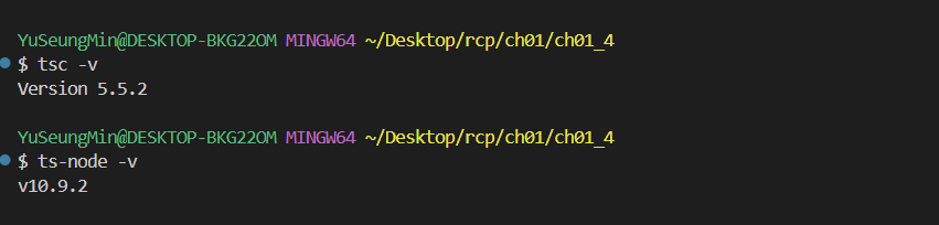 이후, 제대로 설치되었는지 확인을 하기 위해서는 tsc와 ts-node의 버전을 확인하면 된다.