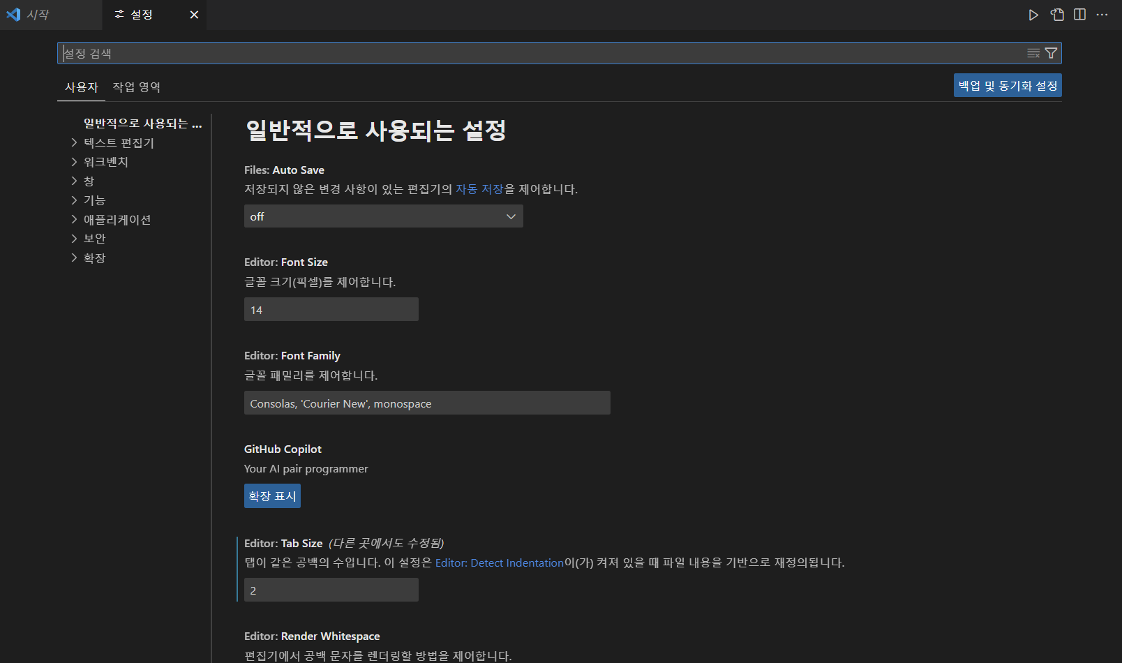 일단 VSCode의 파일 → 기본 설정 → 설정에서 폰트 사이즈, 탭 사이즈 등을 설정할 수 있다.