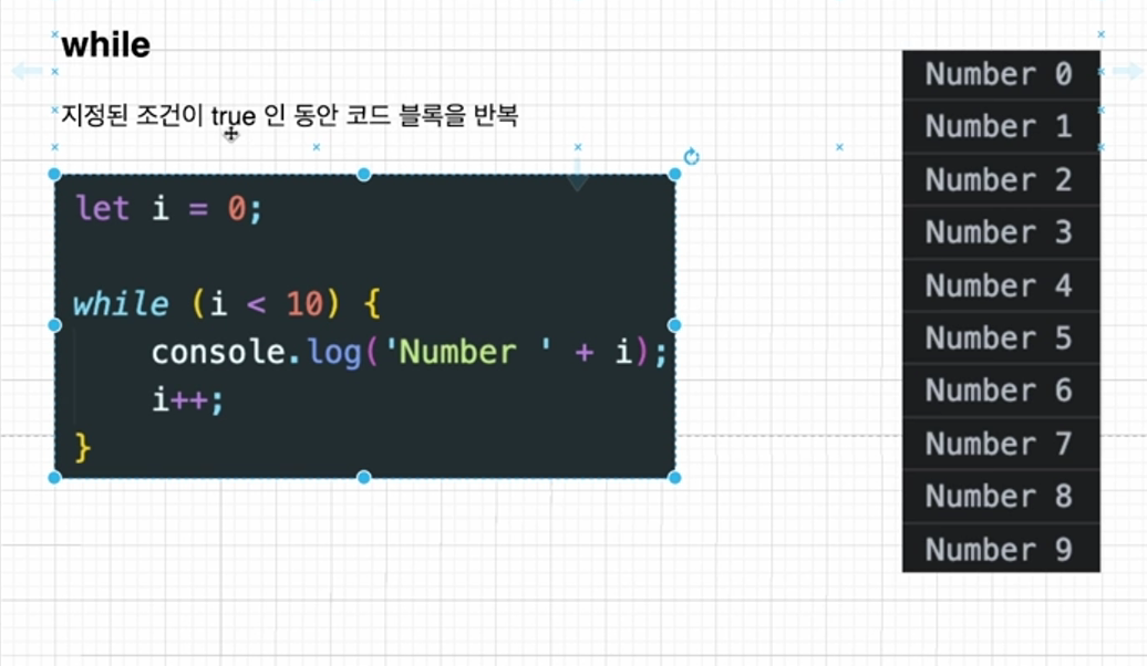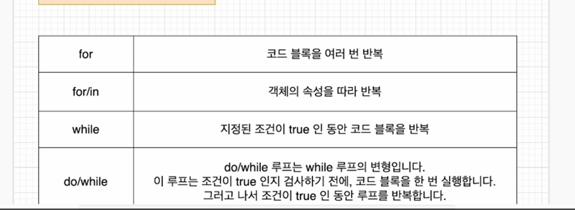 - while : 지정된 조건이 true인 동안 코드 블록을 반복한다.