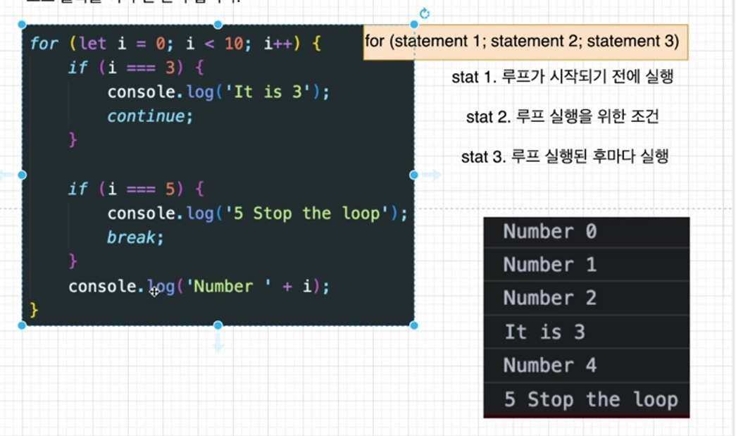 - Loops : 자바스크립트에서 루프(Loop)를 사용하면 코드 블록을 여러 번 실행할 수 있게 해준다.