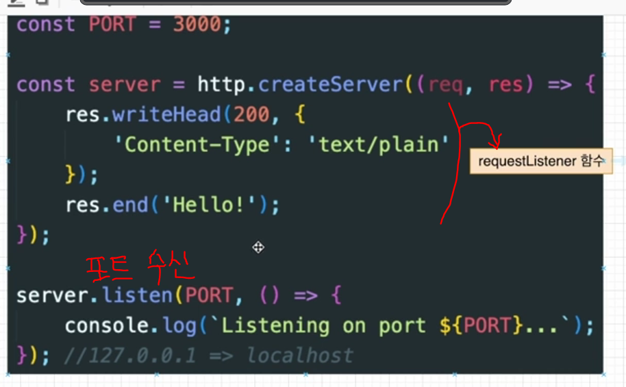 => Server 역시 요청이 와 어떤 이벤트가 이뤄지면 그거에 대한 콜백 함수(requestListenr)가 실행되는 것.