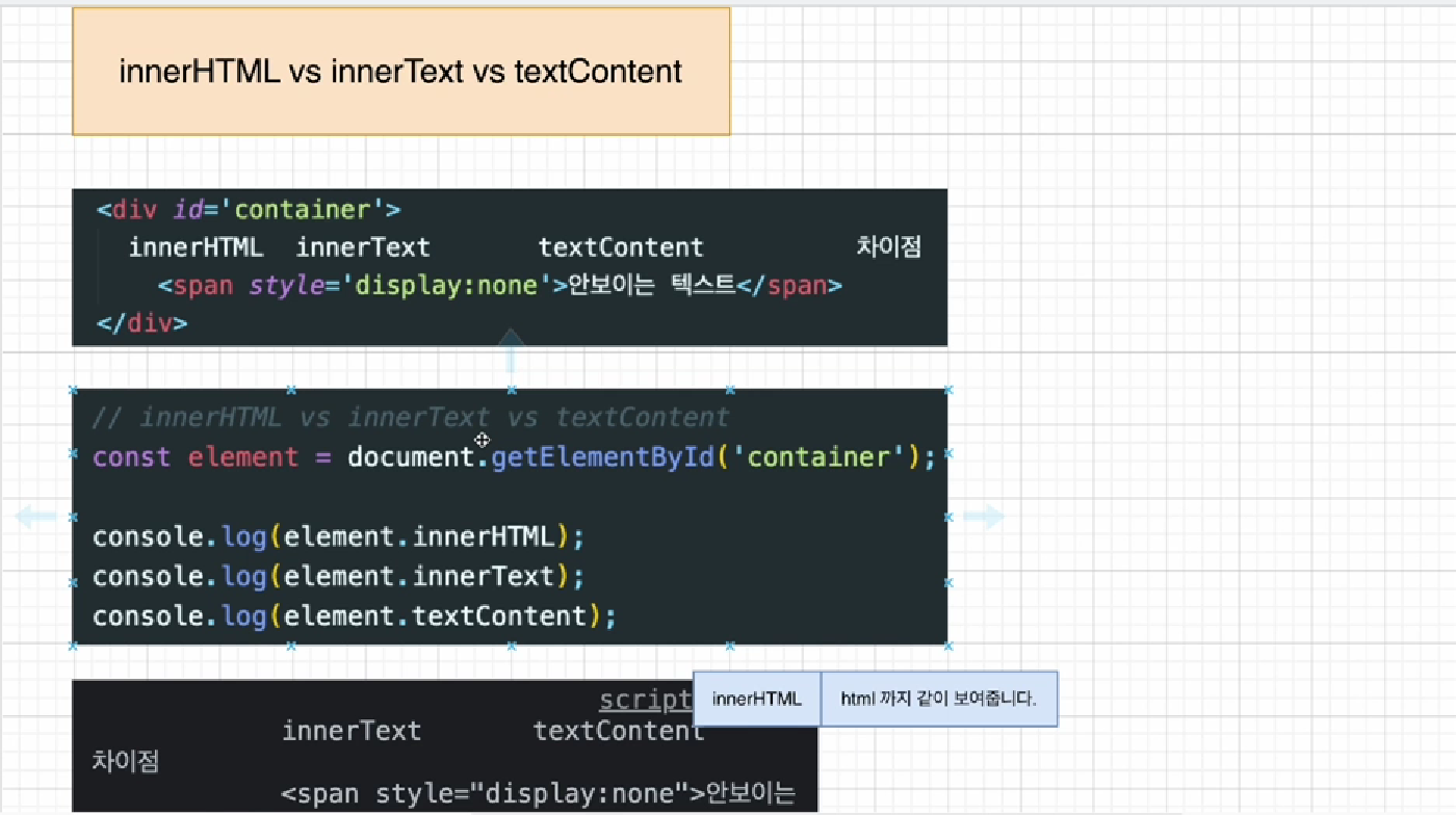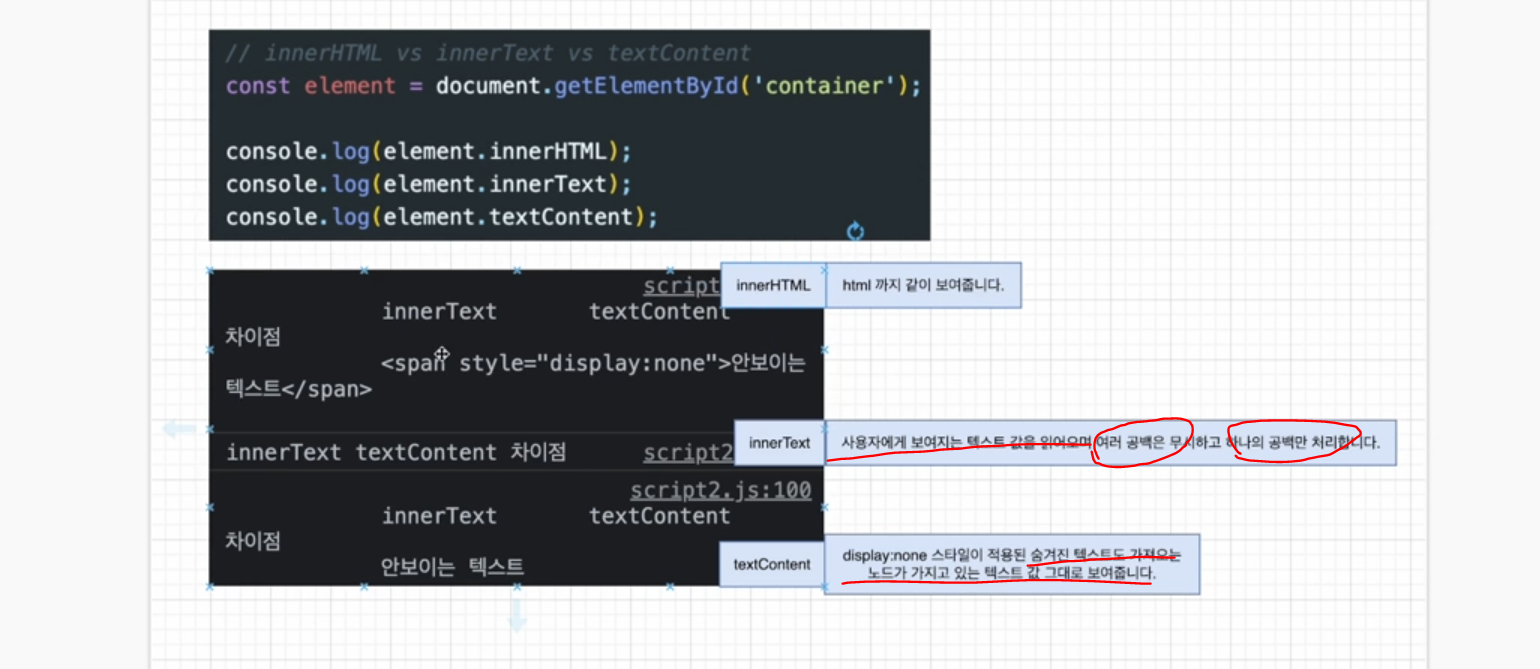 // innerText는 element내에서 사용자에게 보여지는 text값들을 가져오거나 설정할 수 있다는 차이점이 있다.