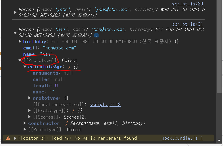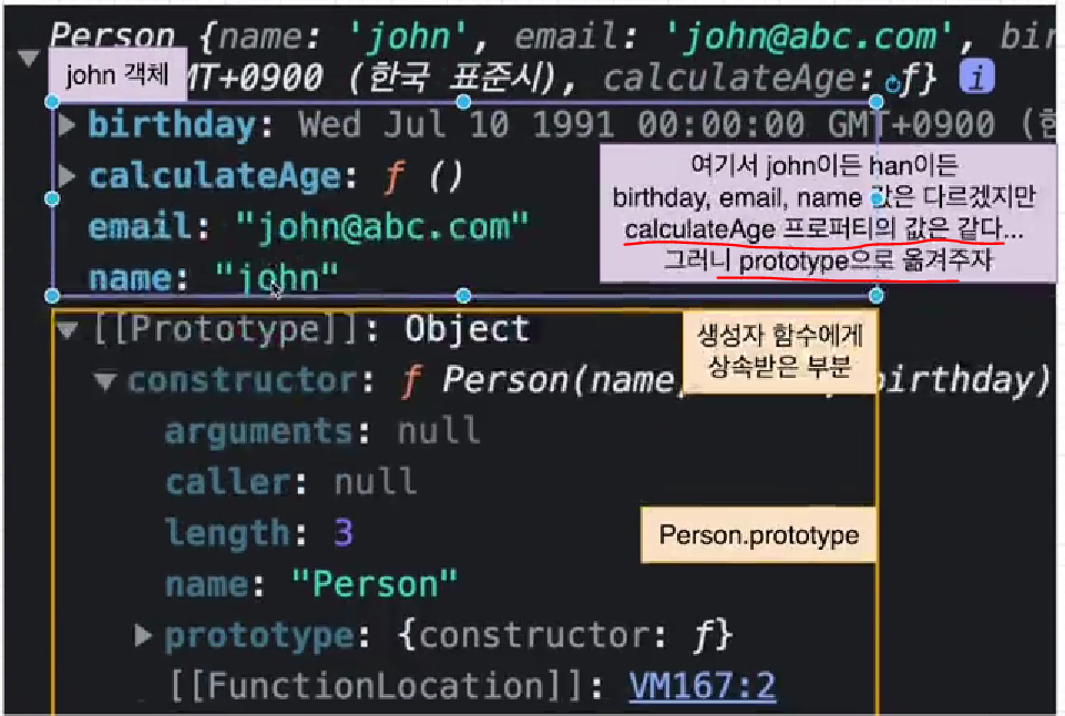 그렇기 때문에 이 calculateAge 메소드를 prototype으로 옮겨줄 것이다.