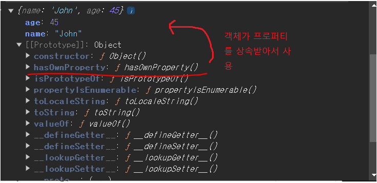 위에서 보듯이 prototype object 안에 있는 hasOwnProperty를 상속받아서 사용하고 있다.