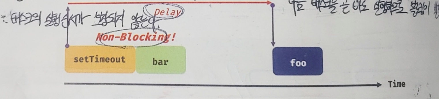 setTimeout 함수 이후의 태스크(bar 함수)는 블로킹되지 않고 곧바로 실행된다.