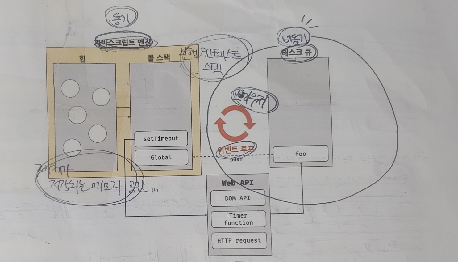 이처럼 콜 스택과 힙으로 구성되어 있는 자바스크립트 엔진은