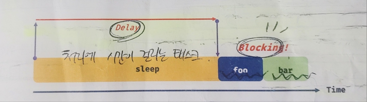 동기 함수의 단점: 앞선 태스크가 종료될 때까지 이후 태스크들이 블로킹되는 단점이 있다.