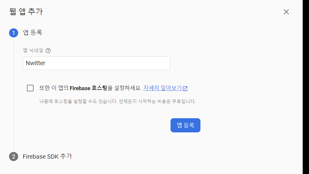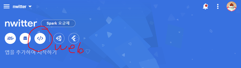 생성한 nwitter project에 앱을 생성해줌(web 형태로 만들 것이므로 web을 선택하여 진행)