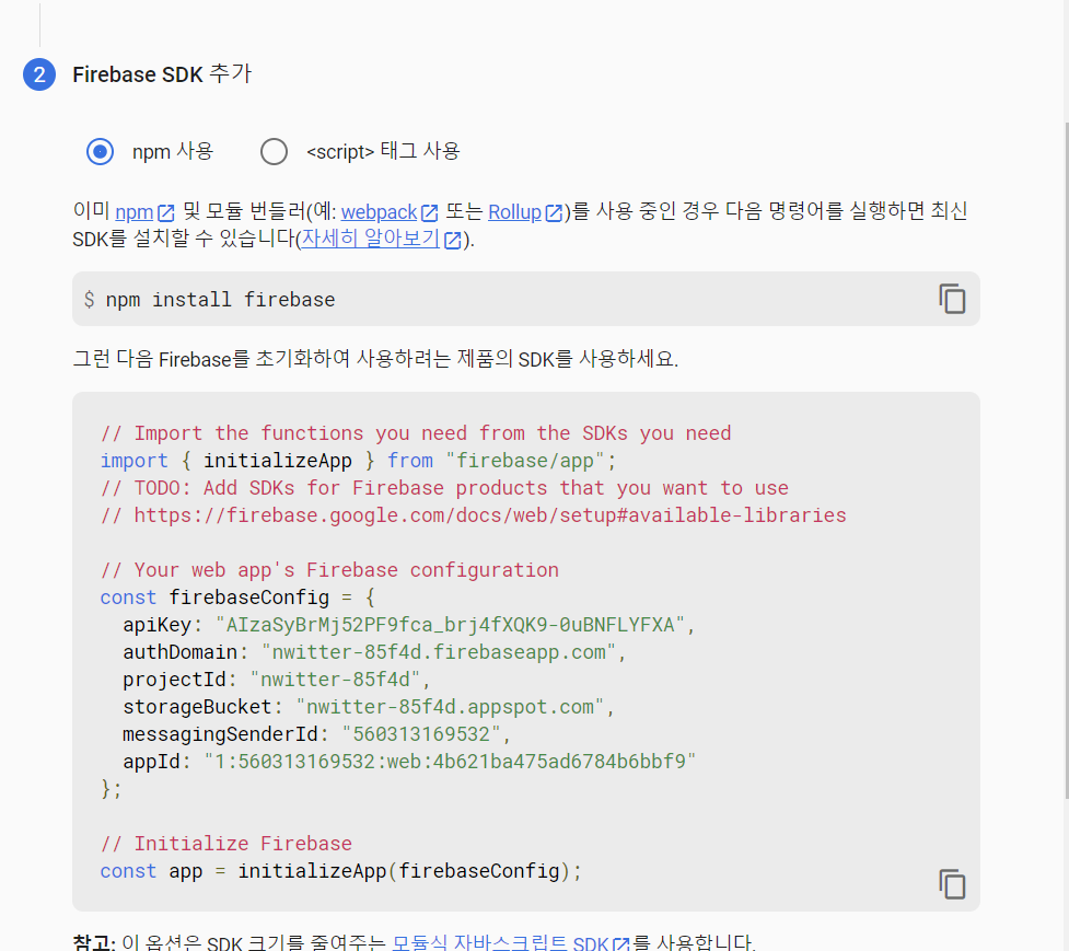 터미널을 이용하여 npm i firebase@9.6.1를 설치해준 후,