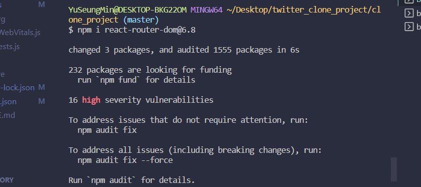 이제 터미널에 npm i react-router-dom@5.3.0 명령어를 적어 router를 설치해줌.
