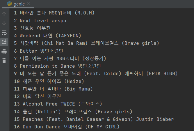 2) 순위와 곡제목이 깔끔하게 나오지 않을 거예요. 옆에 여백이 있다던가, 다른 글씨도 나온다던가.. 파이썬 내장 함수인 strip()을 잘 연구해보세요!